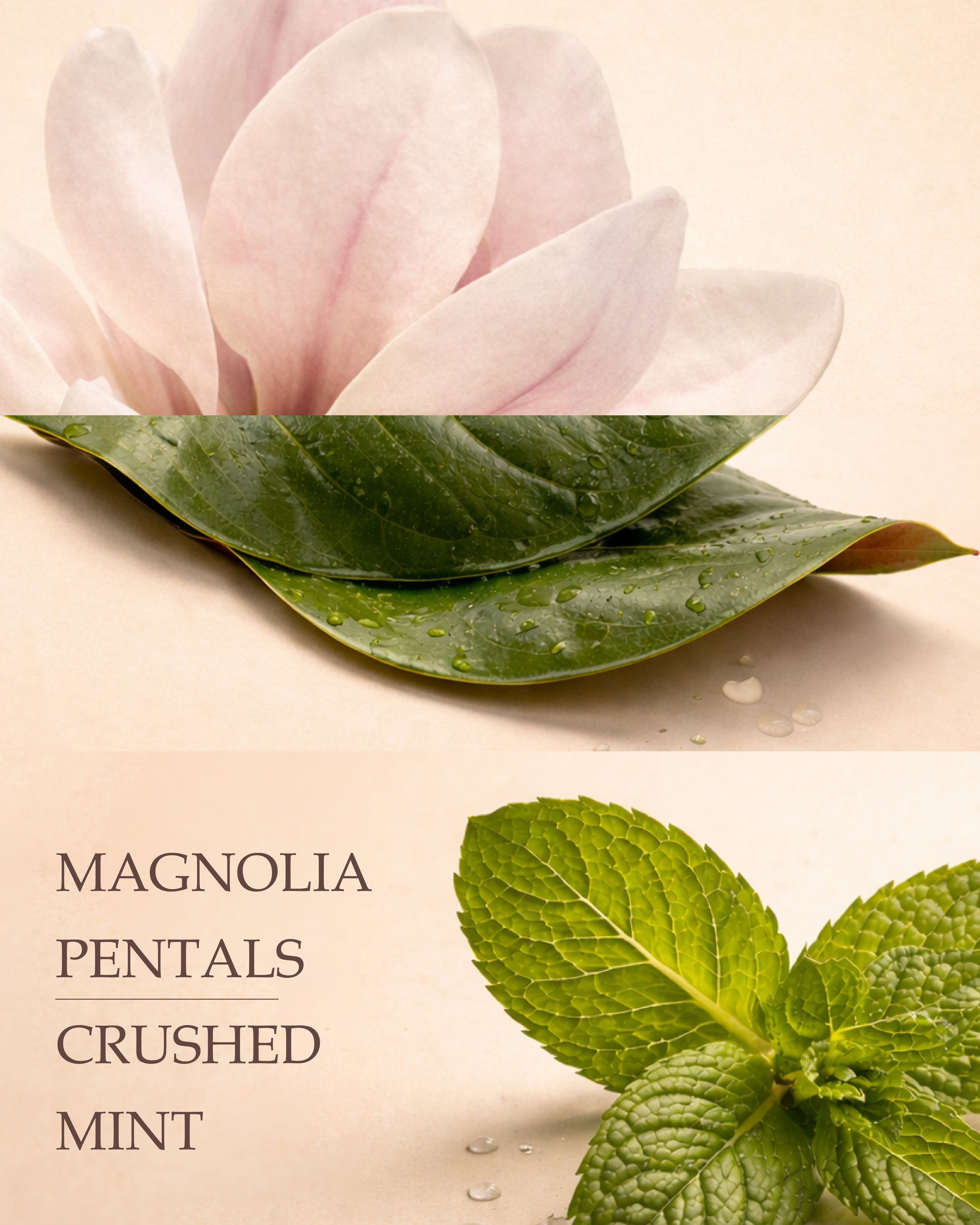 En klar og kølig åbning med bergamot, mynte og eucalyptus, balanceret af magnolias bløde, næsten cremede udtryk.